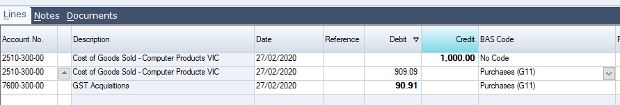 What you want is the transactions to have the code "Purchases G11", and amount to the offset account to be the transaction amount minus the value of GST, and then another additional transaction for the GST amount, to the GST Acquisitions account and also with BAS Code "Purchases G11".