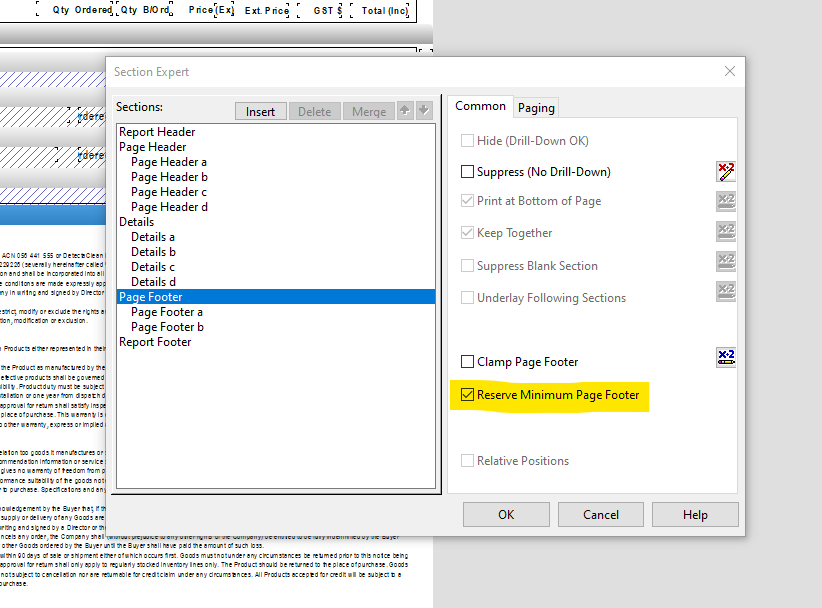 Is there a maximum size for the Report Footer. I want to include Terms and Conditions on the last page, which is not a problem. However, the T&C take up nearly a whole A4 page. No matter what I attempt in suppressing all other sections of the report, I am unable to get the Report Footer to print on one page. As soon as the RF section is longer than about 16cm it will spill over to two pages.
