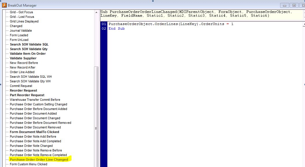 We are upgrading one of our customers from 6.5.13 to Version 7. One of the features required to be ported across is their ability to overwrite the pack order size populated by JIWA in the Qty field, if a product has Order Units in the Supply tab. Eg, If you have 576 order units on a part, when raising a new order, 576 is shown on the purchase order, you then enter eg. 590, then it will update the Qty to 1,152, which is correct. We require this field to be overwritten, if it is required to order an odd lot. This was achieved by a breakout written in the PurchaseOrderOrderLineChangedEvent as below:
