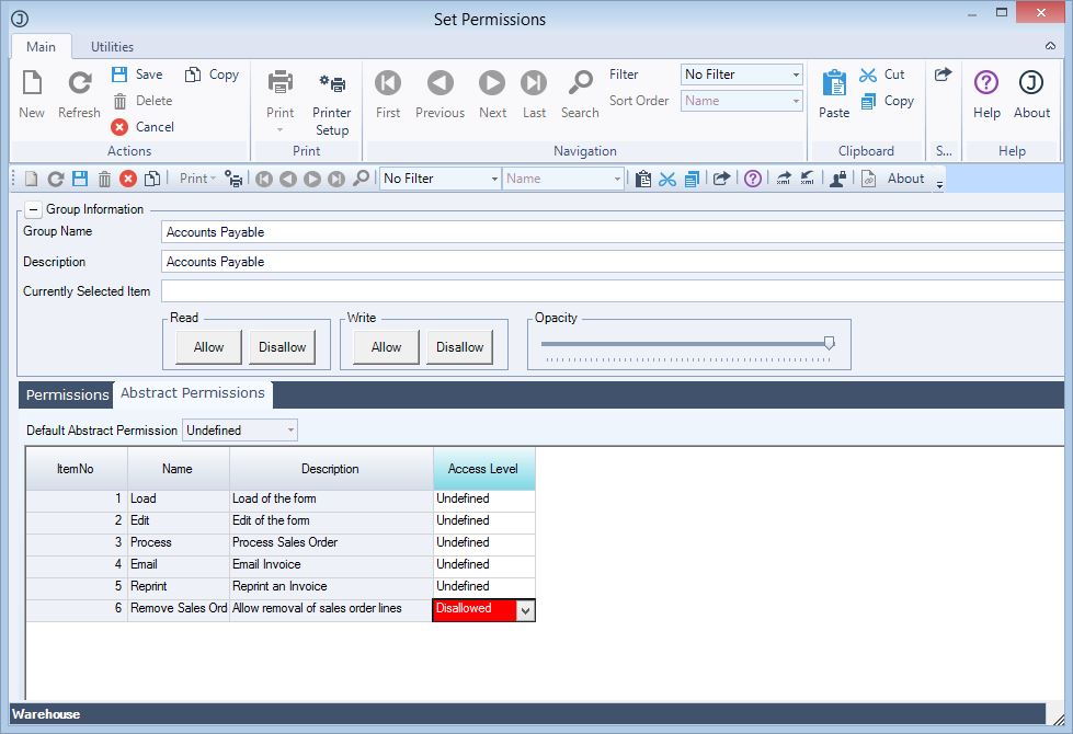 3. Set the permissions - on the sales order entry form, utilities ribbon tab - choose Set Permissions then select the Abstract Permissions tab and locate the new permission "Remove Sales Order Line" - set the permission and save. Remember permissions are masked together for all groups the staff member belongs to, as well as the Default Abstract permission.