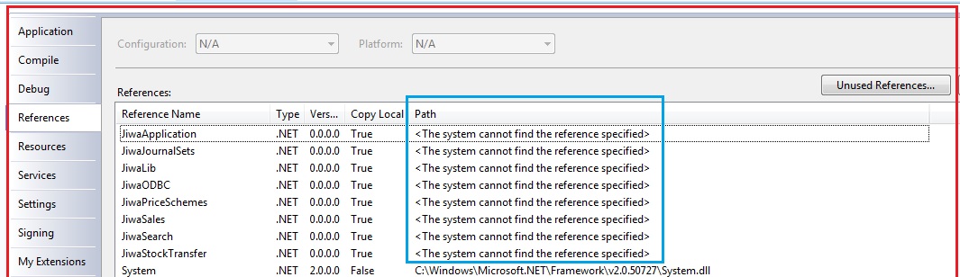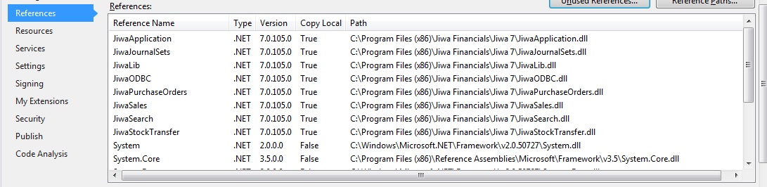 I added reference to some of the Jiwa V7 ( my version 7.0.105 ) assemblies from "C:\Program Files (x86)\Jiwa Financials\Jiwa 7" to my VB.NET ( visual studio 2008 ) project. Set the "Copy Local" as True. But it shows that system cannot find specified path.Please see attached. Have I done something wrong ?