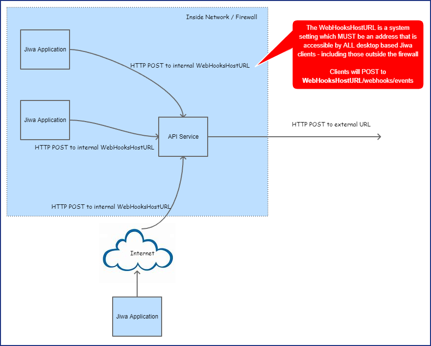 The WebHooksHostURL system setting should be a valid URL accessible by all Jiwa clients. If this URL is not reachable, webhooks will not be sent to subscribers until the REST API service is restarted.