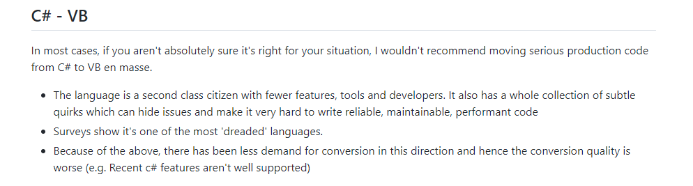 Whilst that may very well be true, their wiki shows a reflection of the attitude of the community in general towards VB. You pondered yourself in a post in this topic why ILSpy didn't have a decompile to VB option - and now you know why.