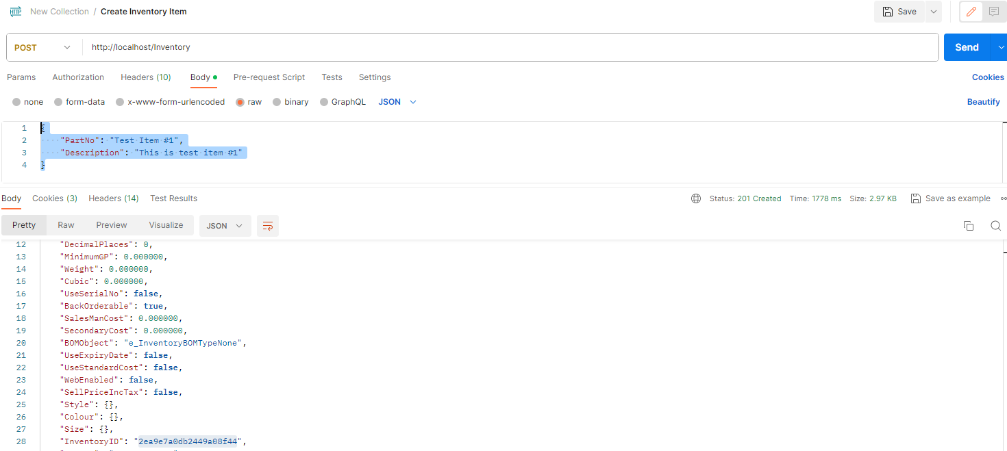 Step 1. Create the inventory item with a POST to Inventory with the following body: