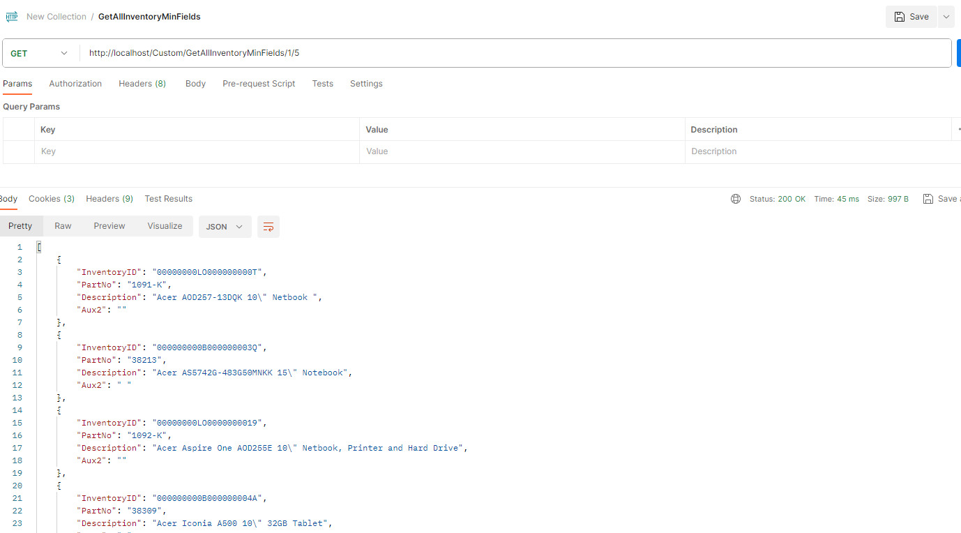 Step 2. Perform a GET on the /Custom/GetAllInventoryMinFields route - you never provided what parameters so I used /Custom/GetAllInventoryMinFields/1/5