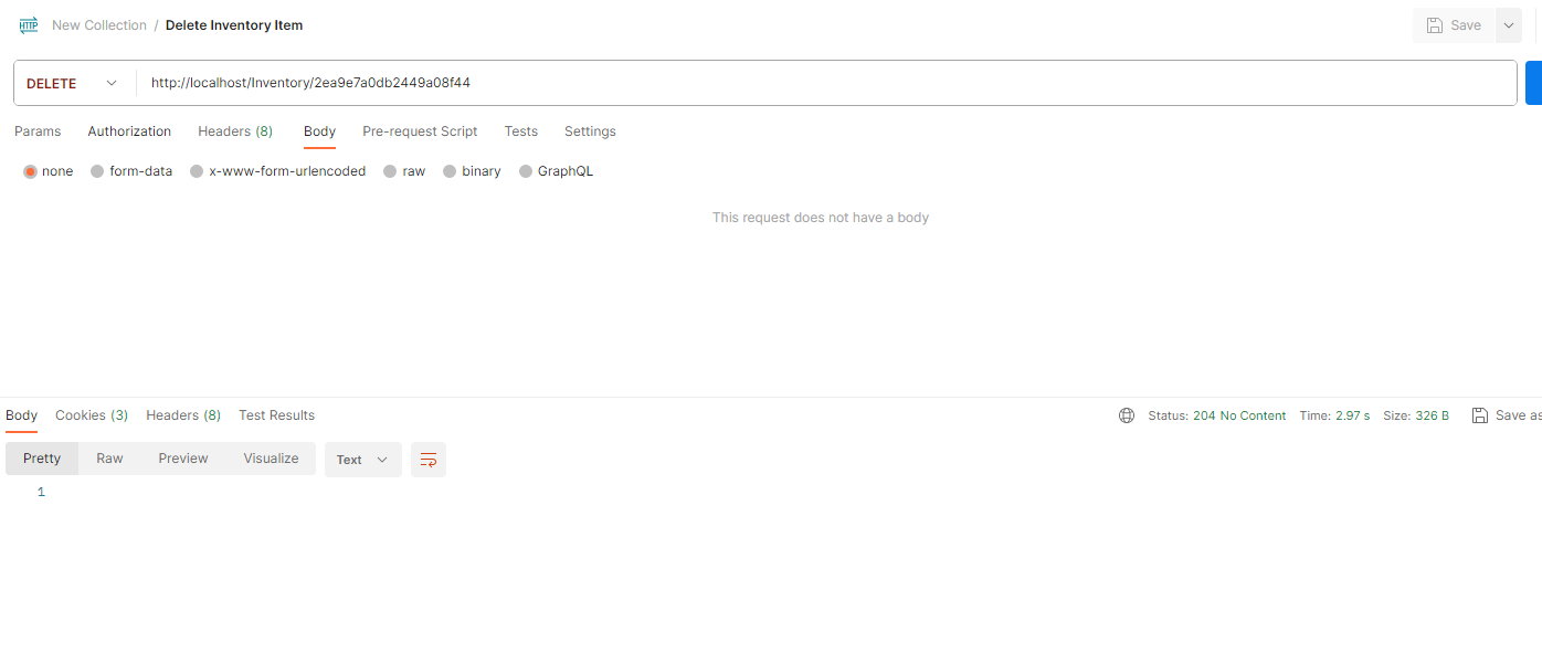 Step 3. Perform a DELETE on /Inventory, with the ID of the previously created item - so /Inventory/2ea9e7a0db2449a08f44