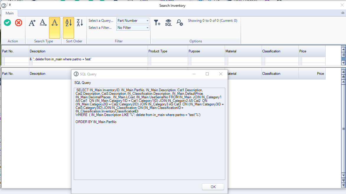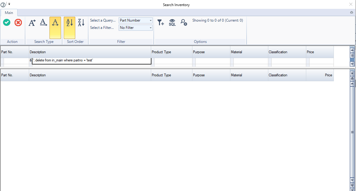 '; DELETE FROM IN_Main Where PartNo = 'test'