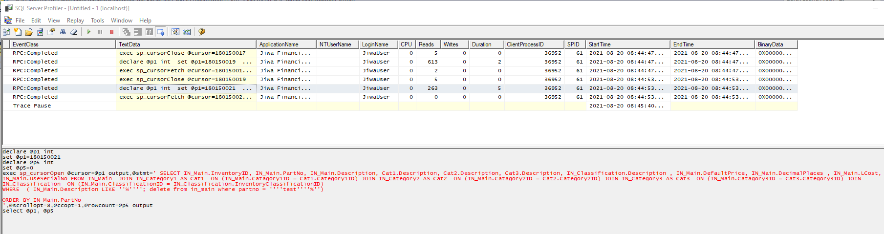 No surprises there - it's taken the SQL and made it a literal string being passed to sp_cursorOpen - which also has to replace all single quotations with two single quotations.