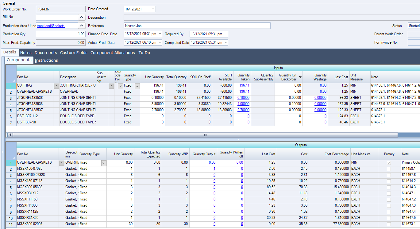 In my example, all of the outputs use the 'CUTTING' and 'OVERHEAD' 'parts', and then at least one of the 'J*' parts. Each raw material 'J*' part is a sheet of gasket material, which gets cut with a laser or mechanical cutter (depending on the material). Because not all gaskets are the same size, it is possible to nest small ones inside large ones, and the amount of raw material used for a small one is (usually, but not always, because geometry) less than the raw material used for the big one. And shapes matter too, because different combinations of shapes can produce less waste for a given sheet of raw material.