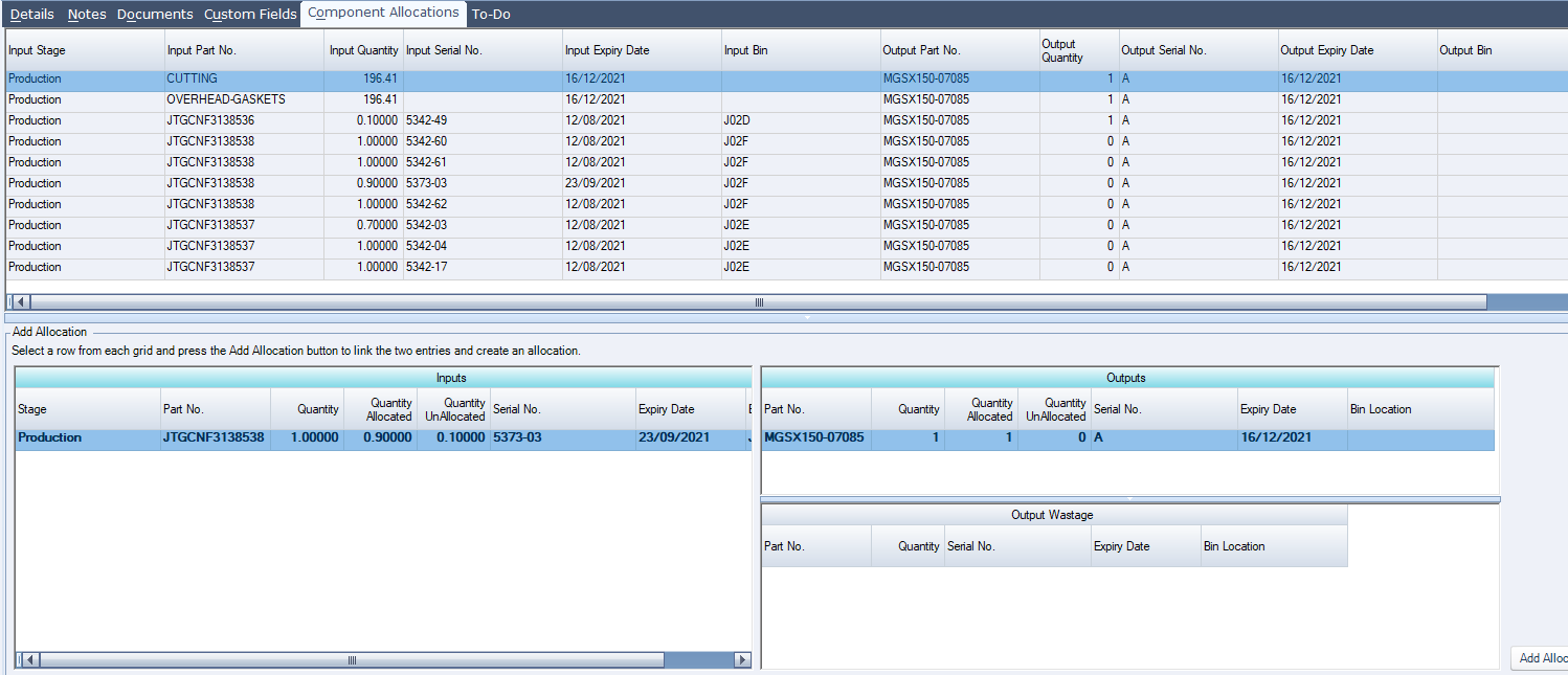 I take a look at the allocations page after adding just the first output quantity of 1 for the first line, I see that it has allocated all the inputs to just one output: