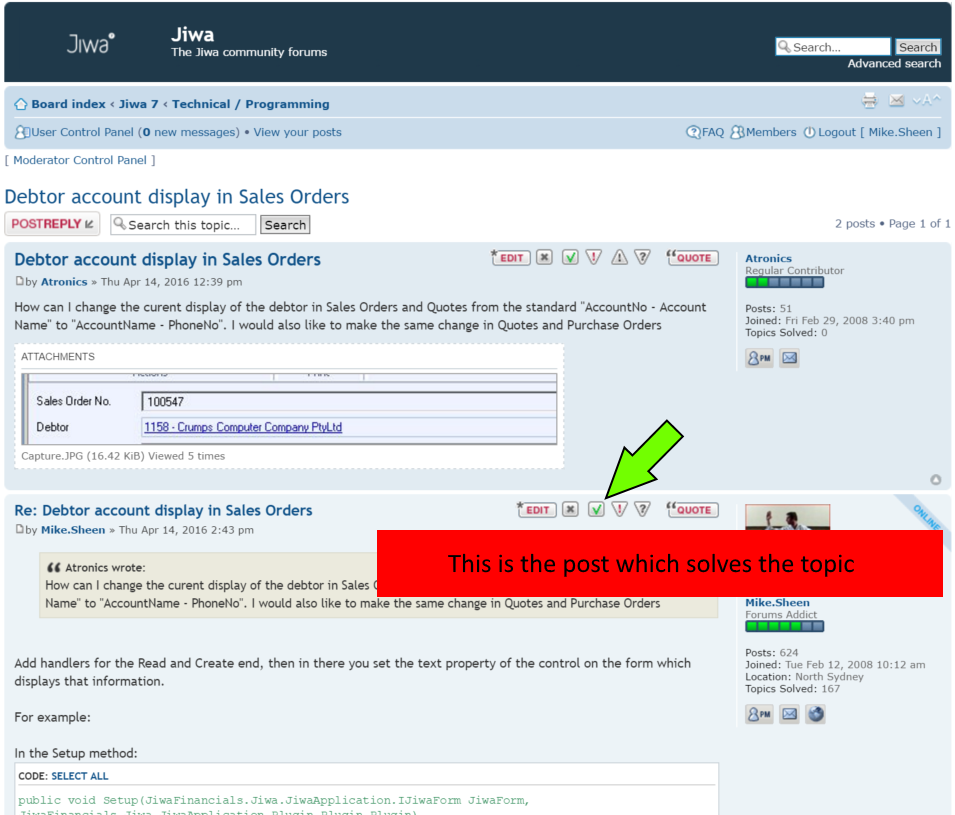 EDIT: There seems to be nobody marking their posts as answered/solved. Below is a screenshot of the button you need to click against the post which answers your question (it's the green tick button)- if you can't see it - let us know - if you can, then please press that button on the post which you think answers or resolves your question/issue ! If after marking it as answered you find it wasn't really answered you can come back and mark it as unanswered - the same button will appear as a red tick - click that to signify it is no longer solved.