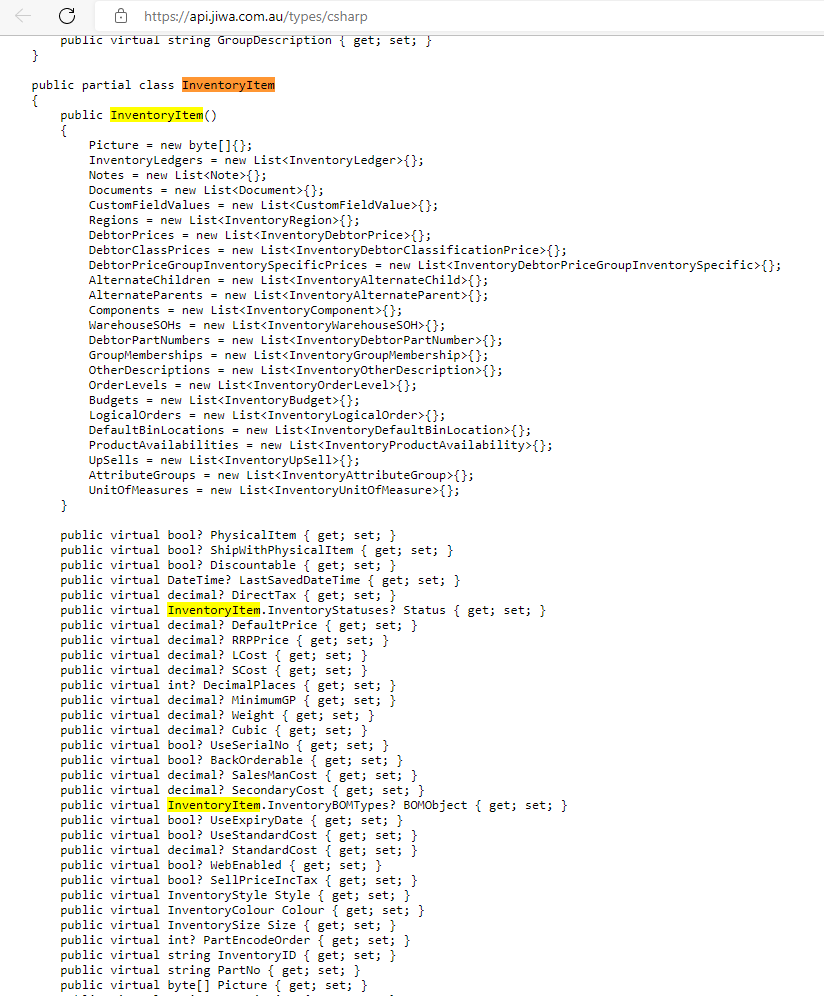 For example, if you perform a GET on /Inventory/{InventorID} that returns a class of type JiwaFinancials.Jiwa.JiwaServiceModel.Inventory.InventoryItem