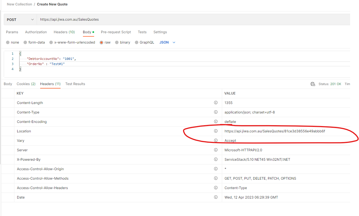 A response header also would have included a location header which is the URI of the resource (quote) you just created.