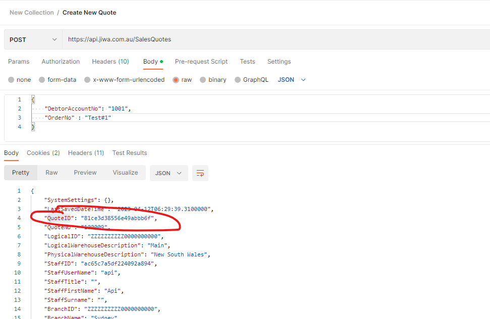 The response body you would have got back would have been the Quote DTO which would have included the QuoteID field which is actually the id of the created quote.