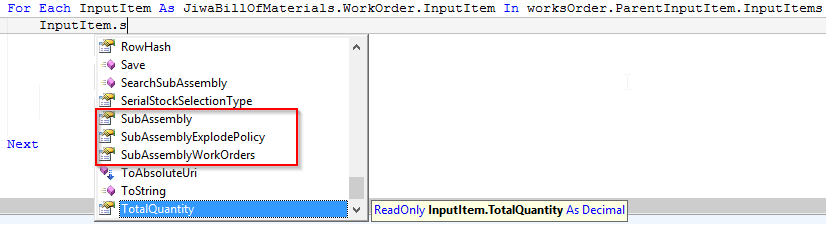 I am trying to write a plugin (vb .net) to do it, i.e. create a Works Order if a component needs it's own Works Order. I am checking the InputItem.IsBOMItem and InputItem.SubAssemblyExplodePolicy to verify if a Works Order is needed. Although when looking at SubAssemblyExplodePolicy, the value is 0 whether the GUI is blank or Always, so not sure that really does anything either.