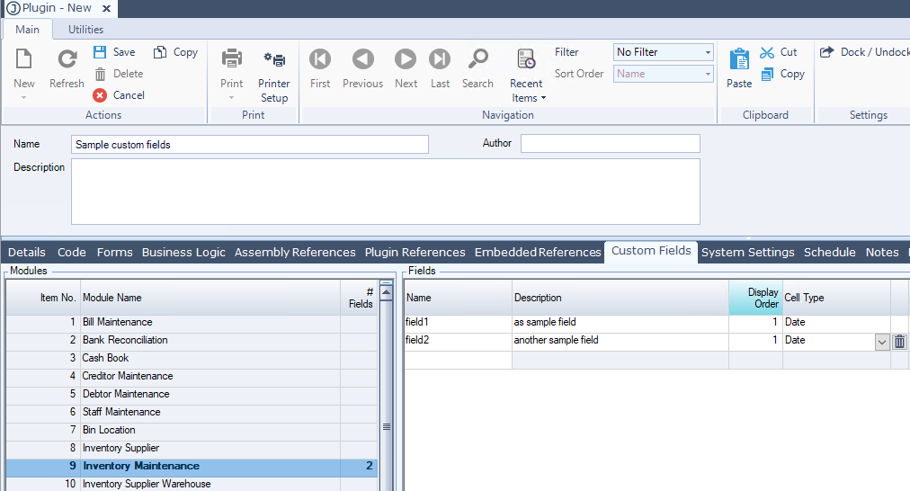 Once defined, the Custom Fields tab of the inventory maintenance form will display the fields and allow the user to edit the values for the item. Each field has a column indicated which plugin the field came from: