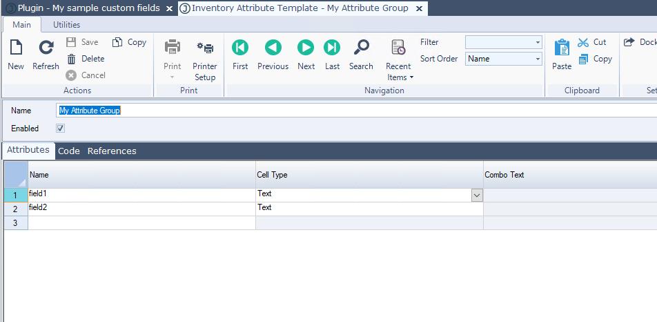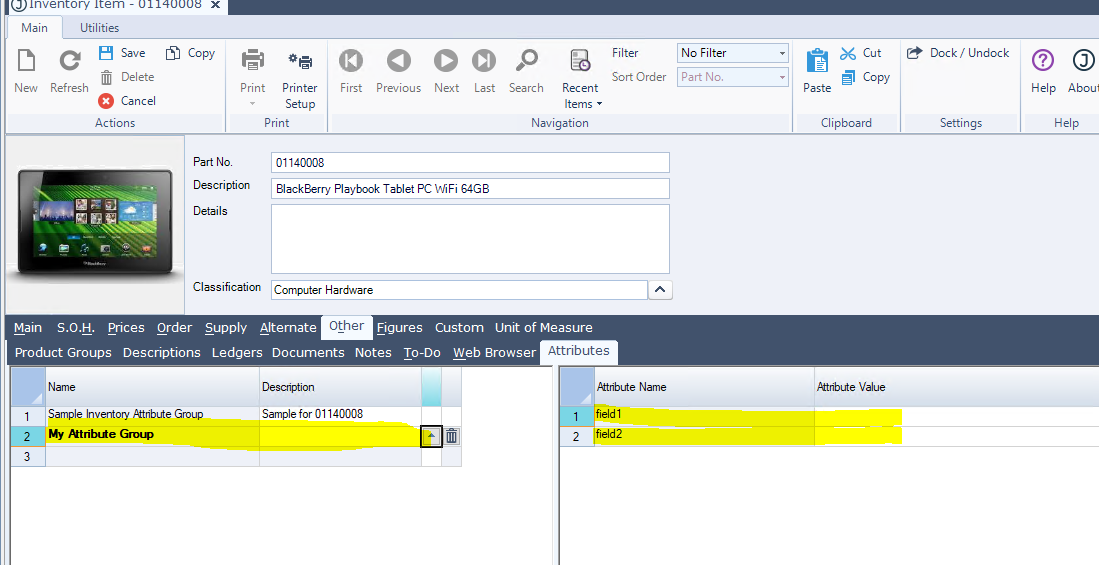 The user can then add this group to an item, and then set the field values via the Attributes tab on inventory maintenance: