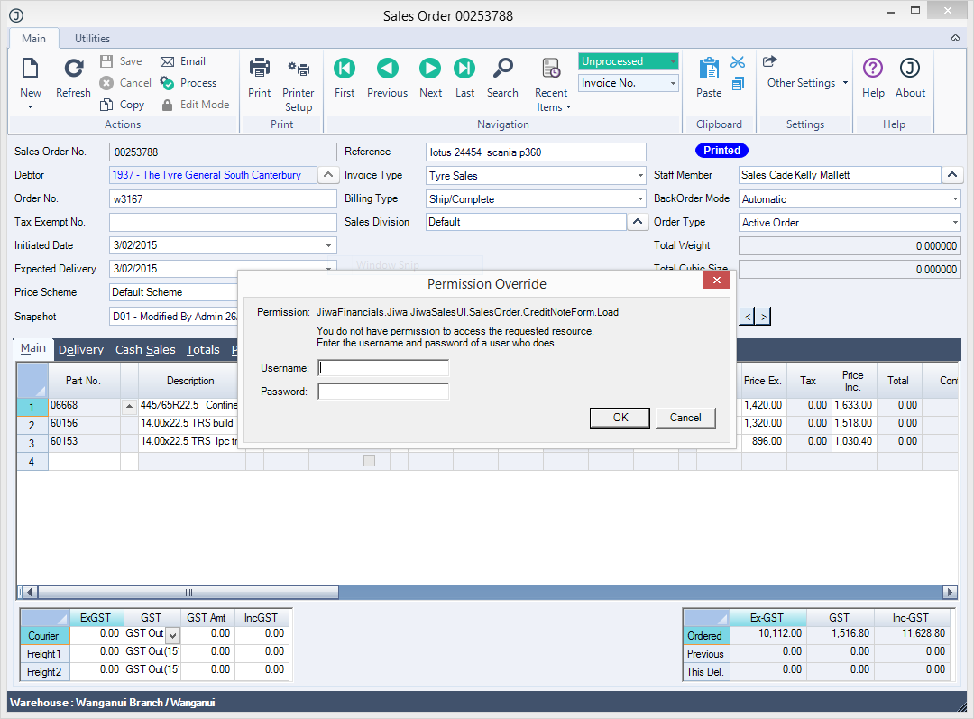 In this example If the user does not have permission to create a credit note, the system will prompt the user to provide the username and password of a user who does have such permissions.