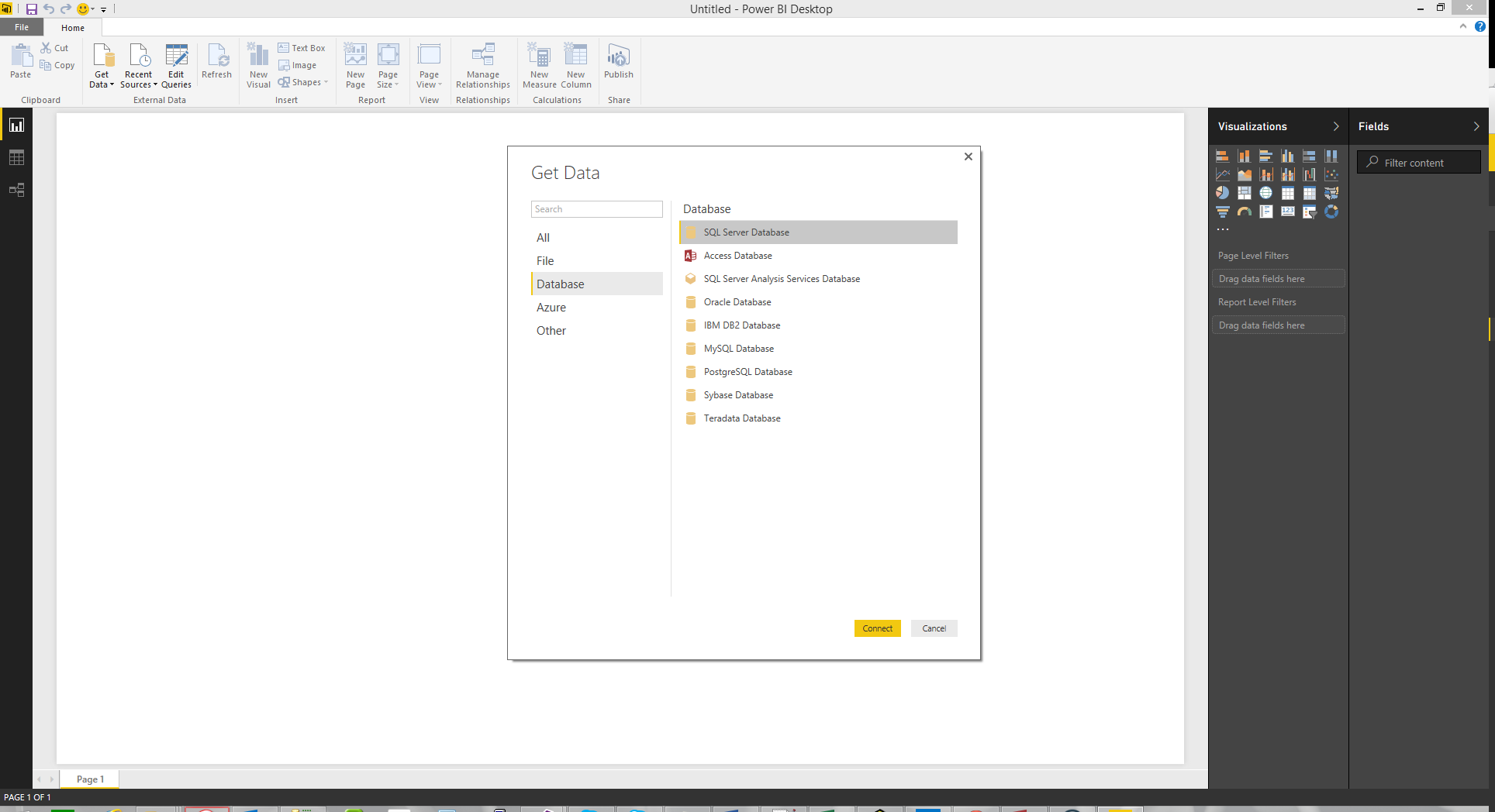 Choose "Database", then "SQL Server Database" and then click the "Connect" button.