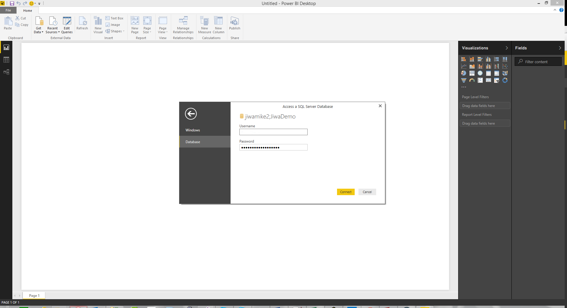 Enter the credentials of a SQL user (NOTE: In my tests JiwaReports or JiwaUser did not work - I had to use sa... If you are connecting to an Azure SQL database, then you should provide the username defined when you created the Azure SQL server), and press "Connect"