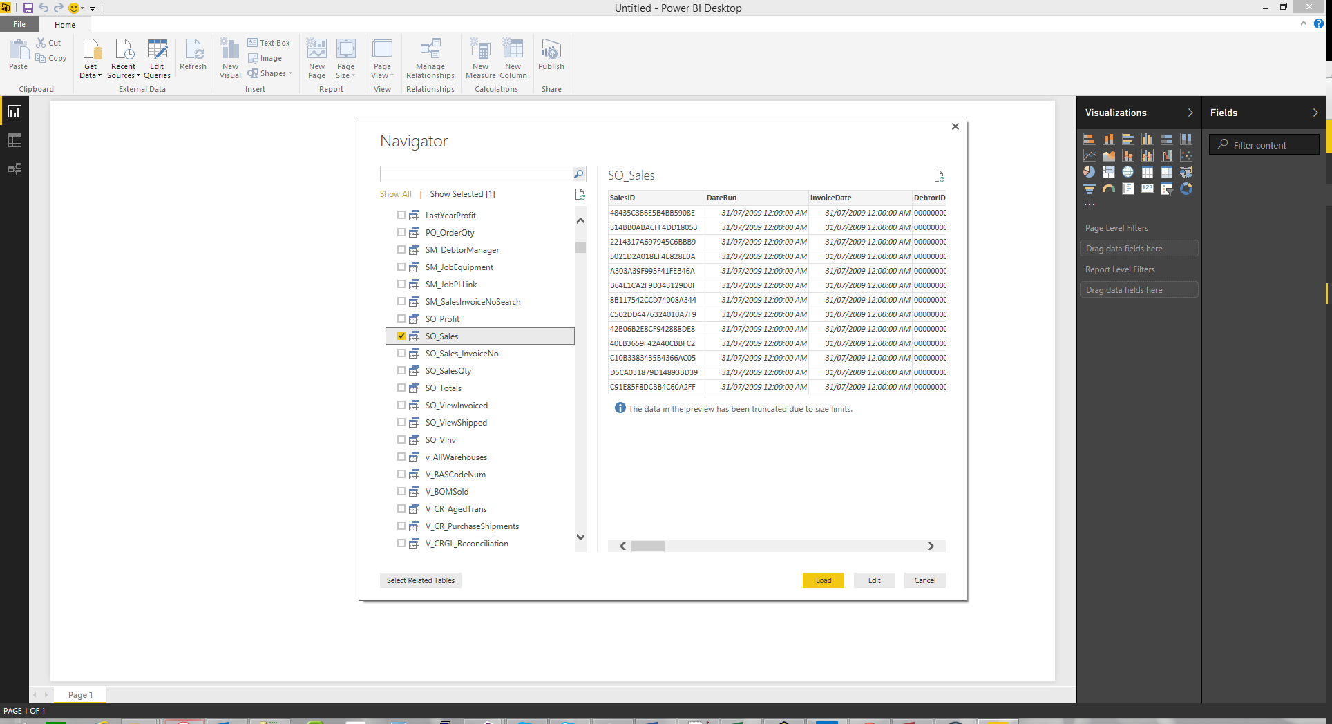 Select tables and views. For this quick example, just select the view SO_Sales - this is the sales history. Press "Load" when done.