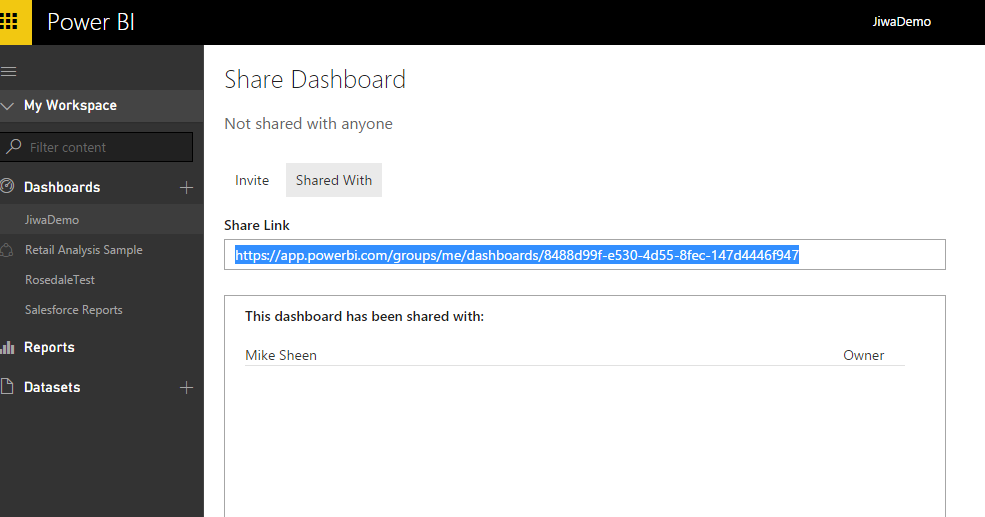 Select the "Shared With" tab and copy the Share link into your clipboard - we'll need that in one of the next steps. Note you may want to also add other people to share with, if they're also going to want to see this dashboard - just add their addresses to the "Invite" tab.