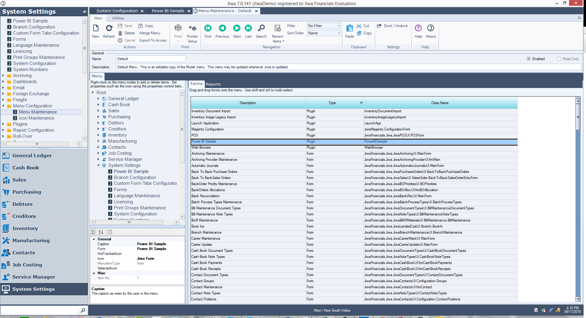 Open Menu Maintenance in Jiwa, and select the default menu. Click on the Type column of the Forms grid until it is sorted so the Plugin forms are at the top. Drag and drop the "Power BI Sample" form onto the menu. Save. Note for a production scenario you shouldn't modify the default menu, as any future upgrade will overwrite it. You should create a new menu, add the Power BI menu option and then attach that menu to a user group. This way the menu option can be explicitly exposed only to certain users. There is also a permission you can set to allow only certain user groups access to the form.