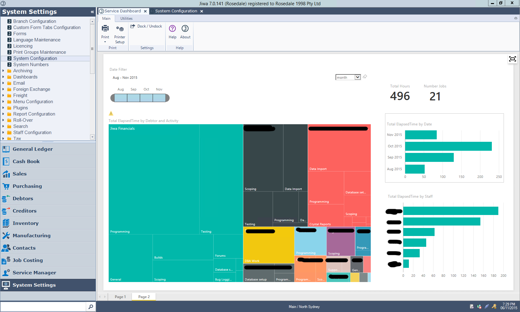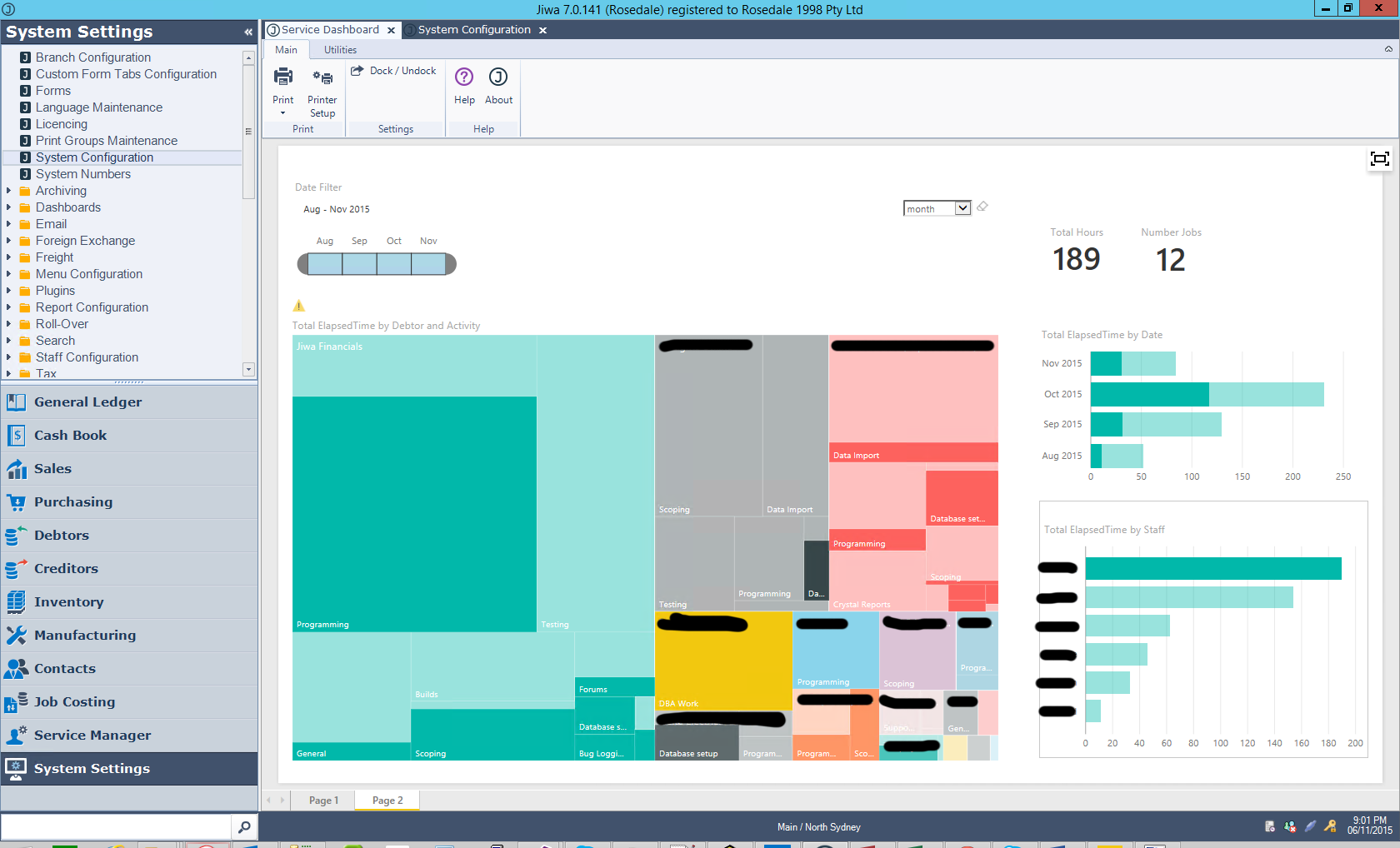 Another example visualisation we've done internally to give an idea of the diverse usefulness of PowerBI visualises the time spent by staff, by customer and activity from Service Manager as a TreeMap: