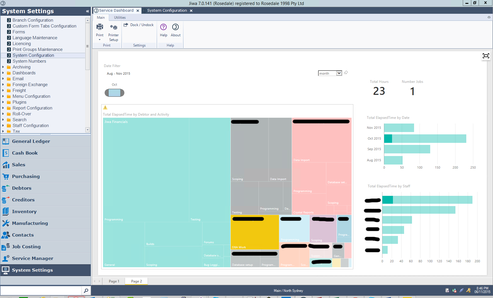 And then clicking on the Yellow/Orange tile, which represents a particular debtor, I can see the breakdown of time by staff and date (month) - in this case, I can see only one staff member spent time on that debtor during the month of October, 2015. I also see the total hours elapsed now showing me a figure just for that debtor.