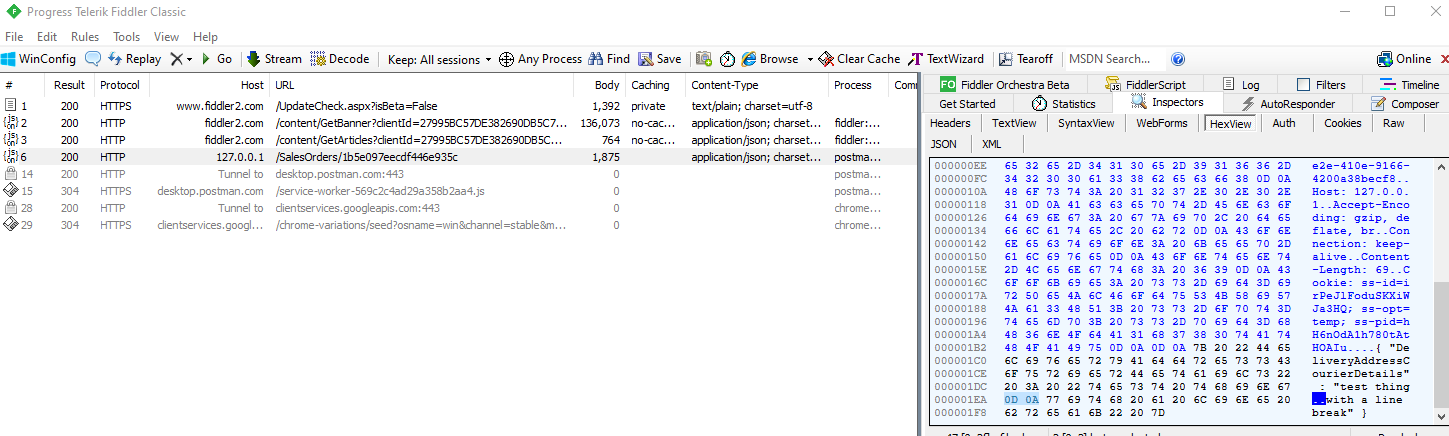 The Fiddler capture of the request reveals Postman translated that to the typical 0D 0A pair: