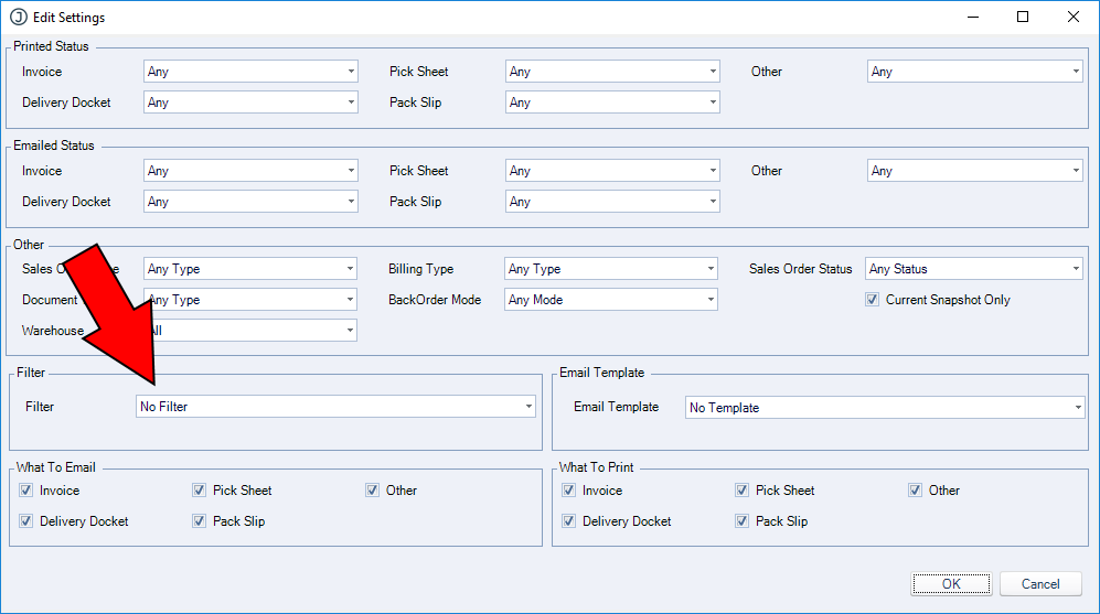 We use a a custom setting called "Bulk Email - Invoices", the linked filter is called "FP Default Filter" and was created for us by our JIWA service provider.