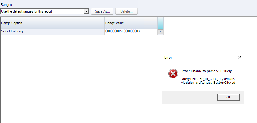 We need to have a parameter values passed to a report, where the parameter range values are obtained using a custom stored procedure. Using the below at the moment which shows the parameter in the report and also fills the default value correctly, but when we try to do a lookup , it comes up with the attached error, can you pls advise