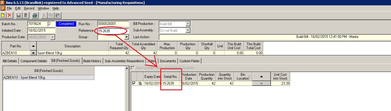 The attached plugin will set the serial number of the output items upon closing of the order - this results in the SOH records created also having that serial no. as well.